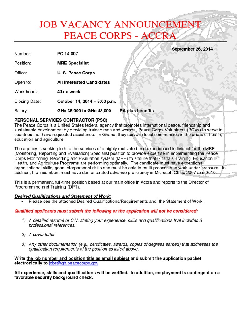 Peace Corps Mre Monitoring Reporting And Evaluation Specialist